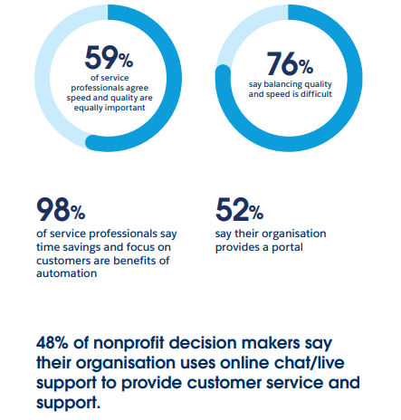 Uživatel digitálních nástrojů dnes dává přednost rychlé, účelné a výkonné službě – téměř 60 procent lidí vyhledává samoobslužné nástroje pro jednoduché dotazy a rychlé řešení problémů, přičemž tento podíl vzrostl během uplynulých tří let o 114 %! Bez přehánění lze konstatovat, že stále více lidí v současné době preferuje rychlost služeb před jejich bezvadnou kvalitou. Neziskové organizace sice usilují o pohotové poskytování co nejlepších služeb, ale více než tři čtvrtiny z nich přiznává, že dosáhnout ideální rovnováhy mezi oběma přístupy není nic snadného.