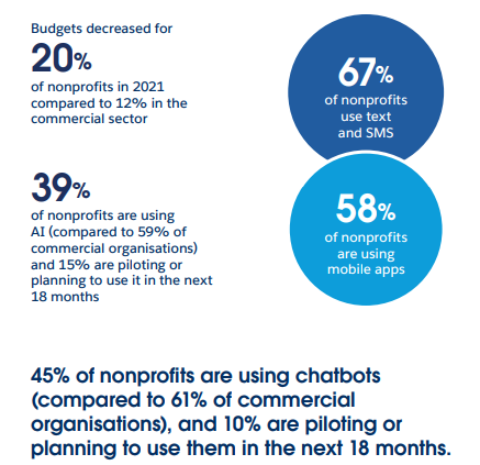 Náklady rostou a rozpočtáři jsou stále opatrnější. Neziskové organizace proto hledají možnosti, jak a kde ušetřit, jak zvýšit efektivitu při poskytování služeb, ale ne na úkor klientů. Komerční sektor v roce 2023 výrazně investoval do automatizovaných procesů a umělé inteligence (AI). Z průzkumu vyplývá, že chatboty provozuje už 61 % firem a jen o dvě procenta méně jich využívá AI. Trend komunikace s klienty je v případě komerčních společností zřejmý: omezit lidskou interakci tam, kde se nejeví být klíčová, a nesnížit přitom kvalitu poskytovaných služeb.