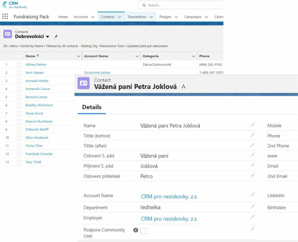 Díky jednoduchému ovládání se rychle zorientujete a brzy budete filtrovat dárce podle celé řady kategorií – třeba výše daru nebo bydliště. Systém vám také pomůže snadno generovat potvrzení o daru či rozesílat hromadné e-maily. CRM Salesforce vám umožní pečovat o jeden jediný balík dat a mít je stále pod kontrolou.